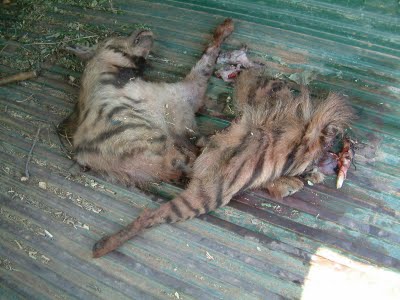 Ik wil hier eigenlijk niet al teveel woorden over vuil maken, maar recente beelden voor zich laten spreken. Ik waarschuw u, de beelden kunnen schokkend zijn. Maar bedenk hierbij dat deze wreedheid zich niet beperkt tot foto’s; ze zijn levensecht en uit deze tijd! Zijn dieren blij met ons? Nou wat denkt u zelf? Help de dieren, kijk elders op deze site bij Wild Cats Conservation Projects.